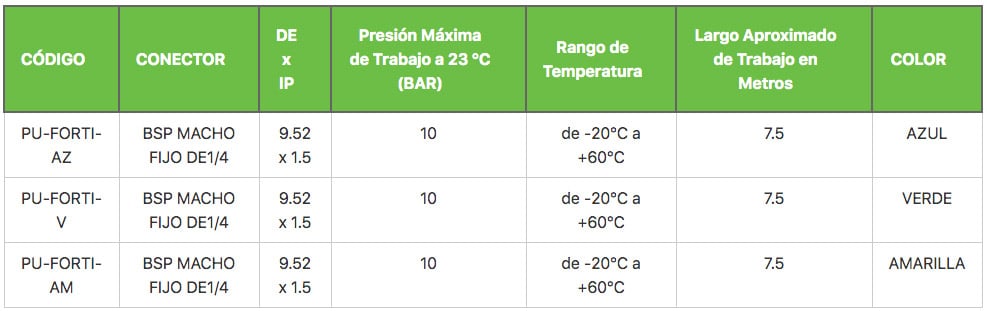 | PU-FORTI-V | BSP MACHO FIJO DE1/4 | 9.52 x 1.5 | 10 | de -20°C a +60°C | 7.5 | VERDE |